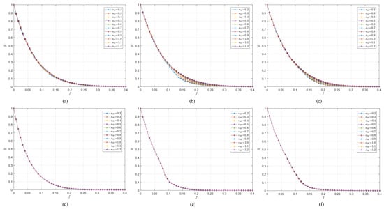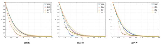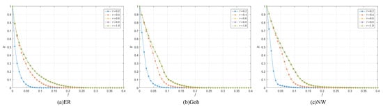 Robustness with different . Panels (a–c) represent the robustness under different when the subnet is ER-net, Goh-net, and NW-net, respectively; (d–f) represent the robustness under different when the subnet is ER-net, Goh-net and NW-net, respectively.