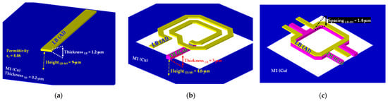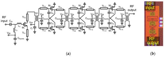 A schematic of the Q-band LNA is depicted in Figure 2a. The first stage of the LNA employs a single-ended structure to eliminate the noise figure (NF) component which would be otherwise contributed by an input balun. The NF is further improved by the source degeneration of a transmission line (TL1). The input is matched to the optimum NF point through L-section matching, which is composed of parallel and series inductors (L1 and L2). All transmission lines are designed in a microstrip structure using the top metal with a 1.2 μm thickness to minimize the loss and chip area, as shown in Figure 3a. The layout of the inductor and transformer are shown in Figure 3b,c, respectively. The inductors were designed in an octagonal shape using the top metal and the inductance was extracted through EM simulation. The transformers were designed using a broadside coupling structure composed of the top two metals (LB and OI).