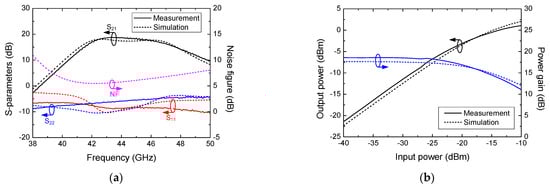 The measurement results for the Q-band LNA are shown in Figure 4. The measurement was performed by an on-chip probing method. Figure 4a shows the S-parameters and NF. A peak gain of 18.8 dB was measured at 43.3 GHz with a 3 dB bandwidth of 5.6 GHz (41.7–47.3 GHz). The input matching was measured below 7.2 dB over the entire 3 dB bandwidth while the simulated NF was below 6.9 dB. Figure 4b presents the power measurement of the LNA at 43.5 GHz. The measured input and output 1 dB compression power (IP1dB and OP1dB) were −22 dBm and −4.5 dBm, respectively.