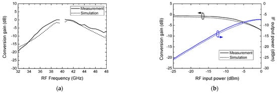 Figure 6 presents the measurement result of the Q-band down-conversion mixer. Figure 6a shows the measured conversion gain versus RF frequency with the LO power of 0 dBm applied at 40 GHz. The conversion gain exhibited a peak value of 0.25 dB at 40.5 GHz and the 3 dB bandwidth was 6.8 GHz (37.3–43.3 GHz). The conversion gain and IF output power at 1.0 GHz versus RF input power at 41.0 GHz are plotted in Figure 6b. The IP1dB of the mixer was measured to be −6.5 dBm. Since the OP1dB of the LNA was −4.5 dBm, as given in Section 3.1, the input drive power to the mixer would be −7.5 dBm taking into account a 3 dB difference due to the output balun of the LNA (TF4 in Figure 2a). Therefore, no gain compression was expected from the mixer.