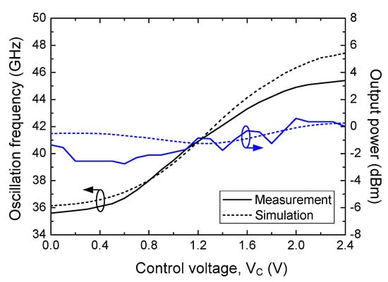 In Figure 8, the measured oscillation frequency and output power of the Q-band VCO are compared with the simulation. As the varactor control voltage (VC) varied from 0 to 2.4 V, the oscillation frequency was tuned from 35.6 to 45.6 GHz (24.6%). The measured output power ranged from −2.7 to 0.6 dBm, including 2 dB of balun loss, which was added only for a measurement purpose.