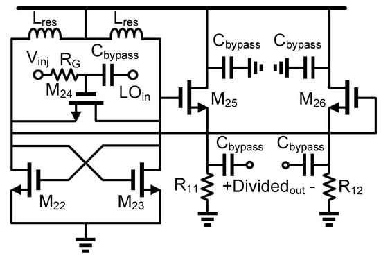 Figure 9 shows a schematic diagram of a basic Q-band ILFD, which consists of a cross-coupled oscillation core (M22 and M23), a resonator, an injection network (M24), and a source-follower buffer (M25 and M26). The resonator, composed of an inductor (Lres) and parasitic capacitances of M22–23, M24, and M25–26, resonates at f0, a half frequency of the injection signal (LOin). The LOin is injected directly into the differential oscillation core through M24. This direct injection enables the extension of the locking range (LR) at a higher operating frequency compared to conventional injection through a tail current source []. The LR of the direct ILFD can be expressed as []