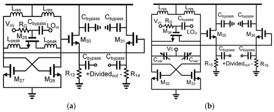 To improve LR of the basic ILFD shown in Figure 9, two variations of ILFD employing a peaking inductor and a varactor, respectively, are presented. In Figure 10a, a peaking inductor (Lpeak) is connected in series with M29j, so that the swing of Vds and thus Iin of M29 increase. This leads to a wider LR. In Figure 10b, a varactor (Cvar) is added to tune the free-running oscillation frequency. Therefore, the LR can be extended by adjusting the oscillation frequency in accordance with the injection frequency. The parameter value of each component is presented in Table 4.