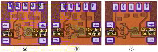 Figure 11 shows the chip micrographs of the basic ILFD, ILFD with a peaking inductor, and ILFD with a varactor. The chip sizes were 0.62 × 0.58 mm2, 0.67 × 0.58 mm2, and 0.66 × 0.55 mm2, respectively, excluding the probing pads. All chips consumed 26.1 mW of DC power.