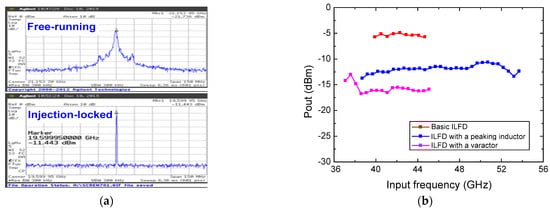 Measurement result of the ILFDs: (a) output spectrum in the free-running and injection-locked modes; (b) LR and output power at PLO = 0 dBm.