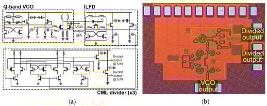 Three different topologies are widely used for a frequency divider at the mm-wave frequency: the injection-locked frequency divider (ILFD), Miller divider, and current-mode logic (CML) divider. Generally, the ILFD operates at the highest frequency with a low DC power consumption at the expense of a narrow bandwidth. On the other hand, the CML divider cannot support a high-frequency operation and consumes high DC power. However, it occupies the smallest chip area, particularly at relatively low frequencies [,]. Therefore, in this work, the frequency divider chain adopted a ILFD for the first frequency division in the Q-band, which was followed by seven CML dividers.