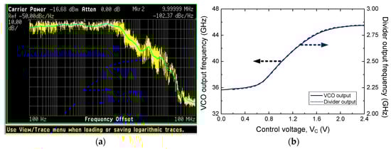 Figure 14 shows the measurement results of the Q-band VCO followed by a 1/16 divider chain. The phase noise of the divided signal was −102.37 dBc/Hz at 10 MHz offset as shown in Figure 14a. Figure 14b shows the output frequency of the VCO and the divider versus the VCO control voltage. It was observed that the frequency division by 16 was exactly performed.