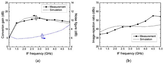 The measurement result of the image-rejection receiver is shown in Figure 16. The conversion gain was measured versus the IF frequency while the LO frequency was fixed at 40 GHz. As shown in Figure 16a, the receiver exhibited a peak conversion gain of 16.4 dB at 43 GHz and a 3 dB bandwidth of 3.5 GHz (1.5–5 GHz). The noise figure was simulated to be 5.8–7.8 dB over the 3 dB bandwidth. Figure 16b shows the measured IMRR, which ranged from 35.6 to 55.1 dBc over the same bandwidth. The input 1 dB compression power (IP1dB) was Ȓ28 dBm at the IF frequency of 2.5 GHz.