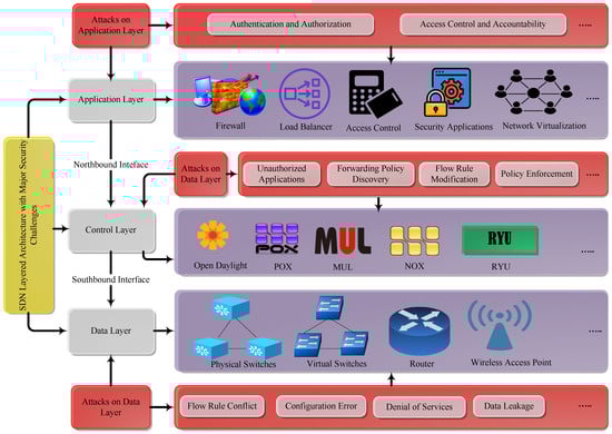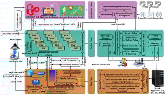SDN also offers a standardized or consistent application programming interface (API) for adding up-to-date programmable features to the network to overcome flexibility and programmability issues in traditional networks. In addition, SDNs help network service providers to obtain a more flexible, manageable, and programmable network architecture []. These properties of SDNs help to empower the control plane and accomplish a global view of network topology to dynamically modify the functionalities of the network. Although SDNs manage networks in a more centralized way, it is now endorsed by both academic and industrial practitioners. This is because security has become a major concern at all levels, especially in newly designed network systems, such as cloud networks and peer-to-peer networks. Therefore, despite the number of advantages, SDNs have many inherent network security challenges, including scalability, reliability, controller placement, and latency []. Moreover, several security attacks were also investigated by other researchers and were examined in other network systems [,,,]. On the downside, the increased potential of security attacks on SDN layers has become a prime concern. The increased potential of security threats, including the consistency of flow rules, controller vulnerability, legitimacy, malicious applications, and standardized and northbound and southbound communications, occurs due to a lack of best practices of SND functions, components, and the open programmability of networks. From the literature, it is clear that due to the multi-layered architecture of SDN, security threats to different layers are different.