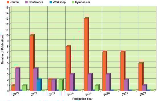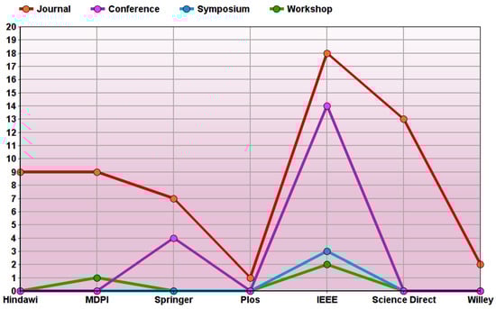 Figure 4 shows the publication sources of selected studies, where we have identified seven different databases. The possible sources for selected studies are IEEE, MDPI, Springer, Science Direct, Wiley, Plos, and Hindawi. Furthermore, the selected channels for this SLR include journals, conferences, workshops, and symposiums. Our results showed that 66% of papers were published in journals, 27% in conferences, 3% in workshops, and 4% in symposia. Note that 44% of articles were published in IEEE journals, conferences, symposia, and workshops; however, 56% of the selected studies were published through other channels.