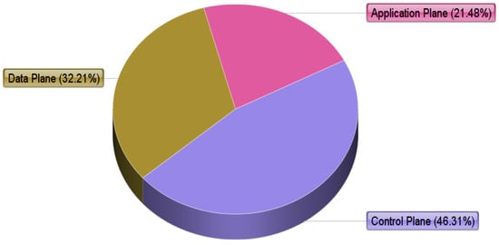 SDNs have become some of the most promising and hottest technologies in terms of flexibility, scalability, and effectiveness due to their wide implementation in different areas, such as data centers, smart homes, smart grids, wireless LAN, etc. However, the architecture is not as mature as required and its centralized control nature has caused a wide variety of new security challenges. Table 3 shows that attack on different planes are different due to the multi-layer architecture of SDNs. Therefore, we classified the security issues on each plane along with their proposed solutions. Attack frequency on the application plane is 21.48%; on the control plane, it is 46.31%; and 32.21% on the data plane, as shown in Figure 6. Among the security threats on SDN planes, we noticed that there has been a significant rise in DDoS attacks. The frequency of DDoS attacks is higher in the control plane when compared to other planes because the controller is only responsible for packet-forwarding decision making in SDN architecture [,,,,,,].