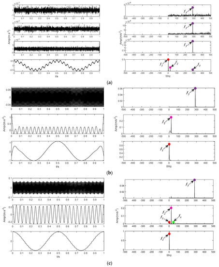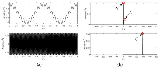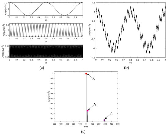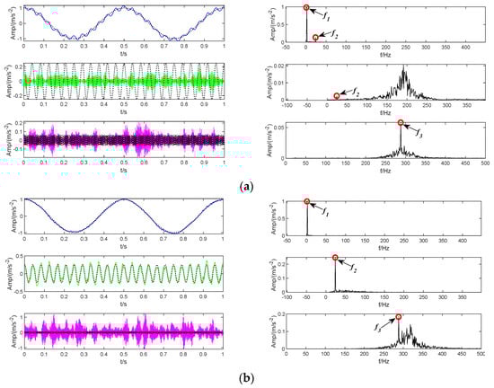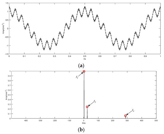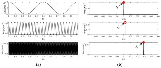 The selection of is related to the noise level of the signal. In practical applications, the noise level of multi-component signals (i.e., mechanical vibration signal) is normally high. If is set to 0, closing the Lagrangian multiplier will essentially reduce Tikhonov regularization to a least-squares form. In other words, even if the noise level of the measured signal is slight, such noise may cause mode aliasing problems. The proposed sparse regularization term with the damping coefficient can still ensure Tikhonov regularization even if the Lagrangian multiplier is turned off. Here, the necessity of is illustrated by an example (the instance is derived from the original code of VMD) []. First, three single-frequency sinusoidal signals with different frequencies ( = 2 Hz, = 24 Hz, and = 288 Hz) are constructed, as shown in Figure 1.