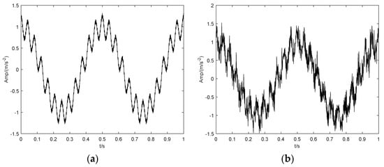 These three signals are linearly superimposed and the mixed signal is shown in Figure 2. In Figure 2a, the mixed signal does not contain noise, but the signal in Figure 2b contains interference with Noise = 0.2 × randn(•) (a normally distributed random number). Then, the signal in Figure 2b is decomposed using the original VMD.