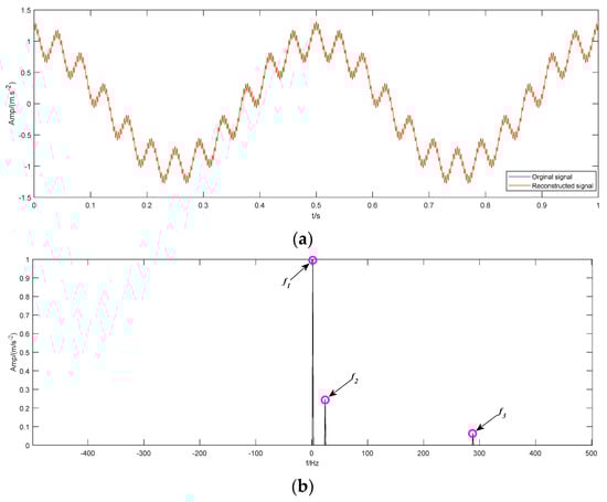 Reconstructed signal and its corresponding spectrum. (a) Time domain. (b) Frequency domain.