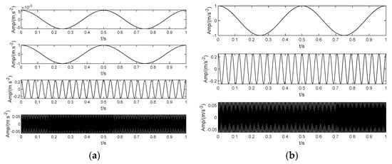The simulated signal for when = 0.2 × randn(•) (normally distributed random numbers) is shown in Figure 11. Here, Figure 11a presents the three original independent signals and noise components, and Figure 11b is their synthetic time-domain waveforms.