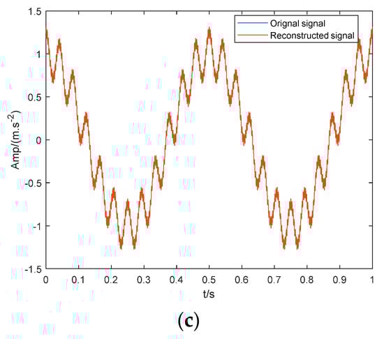 Reconstruction is performed for both IMF components, and the new signal is shown in Figure 7a. The distinctiveness between the reconstructed signal and the original mixed signal is very small, with a reconstruction error of only 1.0 × 10−10. These indicators satisfy the termination of the decomposition condition, but the resulting number of modes is two, while the actual number of components is three. As shown by the experiment, using the orthogonality between the modal components and the reconstruction error of the signal as an evaluation metric for the performance of the decomposition provides an incomplete result. Thus, it is critical to introduce another evaluation parameter to measure the monodromy of the IMF component itself. According to the decomposition strategy of the VMD algorithm, if the decomposition of a single IMF continues, the IMF will replicate itself. Essentially, the signal features are self-replicating and the total energy is invariant. The demonstration results are shown in Figure 8. Finally, the replicated modes can be merged by judging the correlation and the correct decomposition result can be obtained.