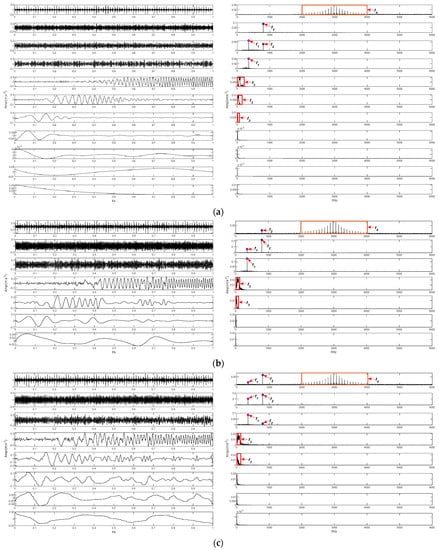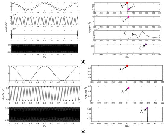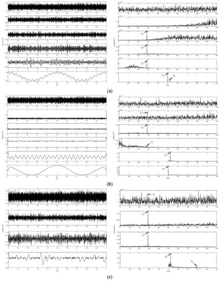 To illustrate the need for the orthogonality and singleness of IMF components, the three harmonic signals ( = 2 Hz, = 24 Hz, and = 288 Hz) in Figure 1a are used as an additional illustration. These three signals are linearly superimposed as mixed signals to be decomposed, and the results are shown in Figure 5.