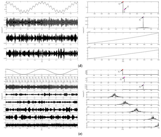 Comparison of the processing results under different methods (case 2). (a) Results for CEEMDAN. (b) Results for LMD. (c) Results for ITD. (d) Results for SVMD. (e) Results for ASparse-VMD decomposition. The left diagram is the components obtained under the selected method and the right diagram is the corresponding spectrum.