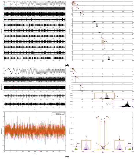 In this section, we further analyze the signal in case 2 using the CEEMDAN, LMD, ITD, SVMD, and ASparse-VMD methods. Figure 14a presents the results of CEEMDAN decomposition. The CEEMDAN method yields 11 signal components. Two dominant modes, and , appear in the IMF3 component, indicating aliasing. The same mode appears between adjacent components (such as in IMF2 and IMF3, in IMF3 and IMF4), indicating mode replication. The FM signal in the original signal is decomposed into three IMF components (IMF 5, 6, and 7) in different frequency bands. As shown in Figure 14b, LMD obtains seven signal components. Apparently, modal aliasing occurs between PF1 and PF3 components. The original FM signal appears in three different frequency bands (PF3–PF5), and some distortion occurs. The results of SVMD decomposition are shown in Figure 14d, where the decomposition parameters are set as = 30,000, = 0 and = 4. SVMD decomposes 11 signal components, and the first three IMF components (IMF1-IMF3), respectively, correspond to , and, in the original signal. However, the periodic pulse component in the original signal is decomposed into seven IMF components of different frequency bands (IMF4–IMF11), and mixed with random noise. When the set parameters are = 0.01, = 1.0 × 10−1. and = 1.0 × 10−2., ASparse-VMD divides the mixed signal into five modes. Figure 14e presents the result of ASparse-VMD decomposition. Among these components, the modes IMF1–IMF3 correspond to the FM signal , harmonic signal , and harmonic signal , respectively. IMF4 corresponds to the periodic pulse signal , but contains slight noise (random pulse signal ). Here, IMF5 represents the residual random noise n(t). Finally, all IMFs are reconstructed and the reconstruction error is 2 × 10−2.. Additional, Figure 14e shows the reconstructed signal and its corresponding spectrum. As can be seen from the experiments, the ASparse-VMD can efficiently extract each individual signal component of the original signal. This result further demonstrates the effectiveness and superiority of ASparse-VMD.