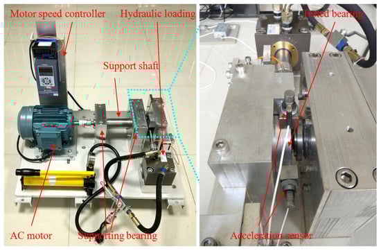 The bearing accelerated life test platform used in this work was designed and manufactured by the joint laboratory of mechanical equipment health testing (XJTU-SY bearing datasets) []. As shown in Figure 15, the platform includes an AC motor, motor speed controller, rotating shaft, support bearing, hydraulic loading system, test bearing, and other connecting parts. The test bearing is a LDK UER204 rolling bearing, which is detailed in Figure 16. The relevant parameters are shown in Table 1.