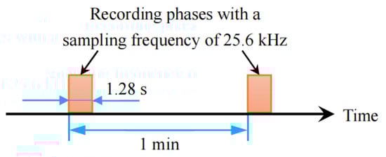 In order to obtain the real-time state of the bearing under the failure condition, two unidirectional acceleration sensors are fixed to the horizontal and vertical directions of the test bearing through the magnetic base to collect vibration signals. In the test, the sampling frequency is 25.6 kHz, the sampling interval is 1 min, and the sampling time is 1.28 s. The sampling diagram is shown in Figure 17.