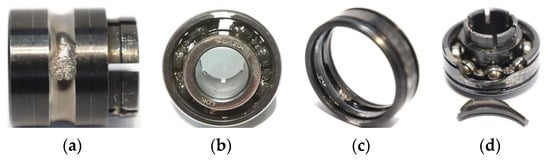 Failure type of bearing. (a) Inner race wear (b) Cage fracture. (c) Outer race wear. (d) Outer race crack.