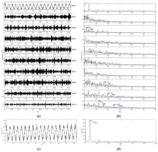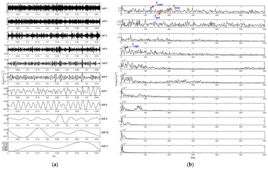 In this section, the CEEMDAN, LMD, ITD, SVMD, and ASPARSE-VMD methods are used to process the measured bearing signals obtained in Figure 19, and the results are shown in Figure 20, Figure 21, Figure 22, Figure 23 and Figure 24. Figure 20 presents the results of CEEMDAN decomposition, which obtained eleven independent IMF components. Among them, a cage fault feature appears in IMF4 and the spectrum of the IMF1 contains the fault characteristic frequencies of the inner ring, outer ring, and rolling body of the bearing. This result indicates the occurrence of serious mode aliasing and, more importantly, the appearance of significant redundant interference in the corresponding spectra.