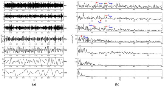 Figure 21 presents the results of LMD decomposition, which was used to decompose the signal into seven PF components. In the first three PFs, inner ring, outer ring, and rolling element fault features are observable. However, some types of fault features are mixed together (such as inner ring and outer ring faults), and appear simultaneously in multiple components (i.e., PF1 and PF3).