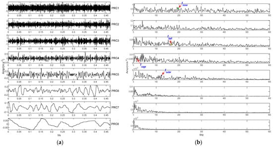 As shown in Figure 22, the ITD method decomposes the signal into eight PRC components. The PRC1 component spectrum contains the fault characteristic of the bearing inner ring, and PRC5 indicates the fault feature of the bearing outer ring. Nevertheless, the relative amplitudes of the two spectral lines are weak and are not prominent under noise items. In terms of other components, the effective information on other faults is not effectively demonstrated.