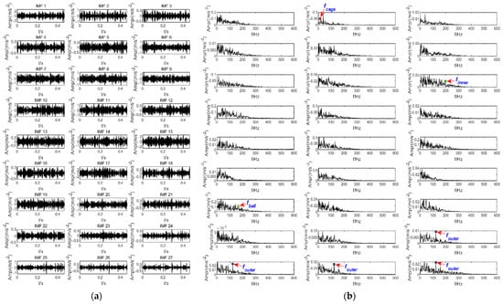 Figure 23 shows the results of SVMD decomposition, yielding 27 IMF elements. In the decomposition process, the inherent hyper-parameters are selected as = 30,000, = 0, and = 4. The IMF2 component contains the fault signal of the bearing cage, IMF9 contains the fault characteristic of the bearing inner ring, and the fault characteristic frequency of the bearing rolling ball exists in the IMF19 component. However, the amplitudes of the required signals are relatively small. The fault characteristics of the bearing outer ring appear in IMFs 24–27, indicating that modal replication (over-decomposition) occurs in the decomposition process. Although SVMD can effectively detect the hybrid fault characteristic frequencies of bearings, this method has many invalid components and suffers from the modal replication problem.