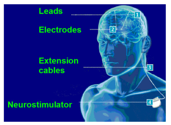 The application of DBS in motor rehabilitation is an alternative to treatments that use remedy and surgery to remove some of the symptoms of motor impairments. The first surgery procedures used to reduce tremors caused damage to the brain and subsequent procedures involved the use of Levodopa which is a remedy that relieves involuntary movements [2]. However, Levodopa had collateral effects such as psychosis and hallucinations. As a solution that does not harm the brain and does not create psychological dysfunctions, DBS was successfully used to treat Parkinson’s disease [3,4], essential tremors [5,6], dystonia [7,8] and chronic pain [9,10]. Furthermore, DBS is also used to treat behavioral dysfunctions such as obsessive–compulsive disorder [11], morbid obesity [12] and depression [13,14,15].