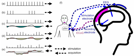 Types of control on DBS systems with a comparison between (a,b) open-loop DBS and (c–e) closed-loop DBS, and (f) illustration of the connections required for stimulation and for the acquisition of biopotentials. Adapted from Hoang et al., [16].