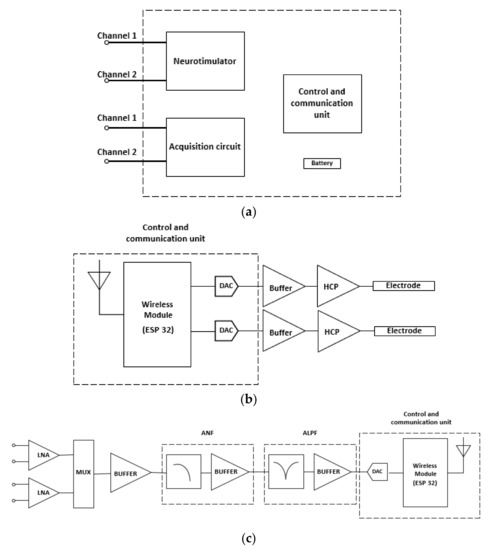 (a) Block Diagram for the stimulator circuit of the DBS system. (b) Neurostimulator block diagram. (c) Acquisition system block diagram.