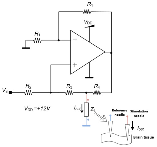 The quantity Vin is the input voltage given by the control unit and R1, R2, R3 and R4 are fixed parameters, which means that the microcontroller can directly alter the current even if the impedance of the body tissue changes during the application of the DBS.