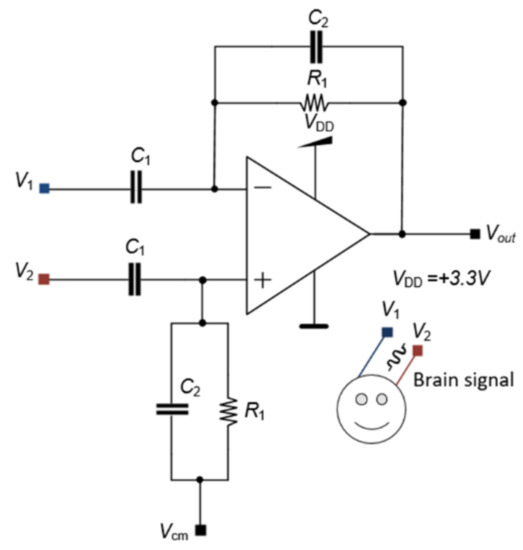 The first stage has an LNA with an elevated gain to amplify low-amplitude signals from biomarkers and improve those signals for the following stages. The LNA also has a high entrance impedance. The LNA circuit has a differential configuration to remove DC components from the input signal. Figure 5 shows the circuit diagram of the LNA with C1 and C2 capacitances to remove the DC component alongside two resistances R1 to polarize the circuit. The electrical supply of the LNA is provided by a single VDD, while the common-mode voltage Vcm is equal to half of the voltage supply, i.e., Vcm = VDD/2 = (3.3 V)/2 = 1.65 V.