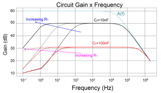 Figure 6 illustrates plots of generic transfer functions of the closed-loop gains, where it is possible to observe the existence of one zero and two poles, as well as their relative positions. These positions are similar to the zeros and poles of the LNA of this paper, because Equation (11), i.e., the full equation of the gain of the LNA for all frequencies, also contains a zero fz = 0 Hz in the origin. This zero is canceled by the first pole fL = 1/(2πR2C2), flattening the feedback gain. The feedback gain starts to decrease from the midband gain of A1[dB] at the frequency of:
