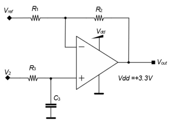 A low-pass filter with gain (ALPF) was built as shown in Figure 8 with R1 = 100 kΩ, R2 = 1 MΩ, R3 = 15 kΩ and C = 1 nF. The gain and cutoff frequency are then given by: