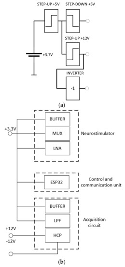 (a) Block diagram of the battery and circuit used to supply the DBS system, and (b) the individual voltages used to supply the neurostimulator, the control and communication unit and the acquisition circuit.