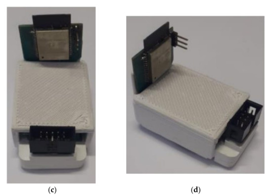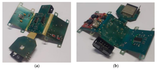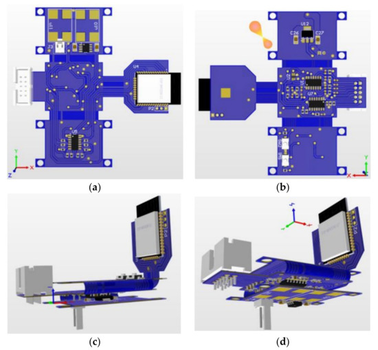 (a) Top and (b) bottom views of the flex–rigid PCB project. (c,d) Two other perspectives.