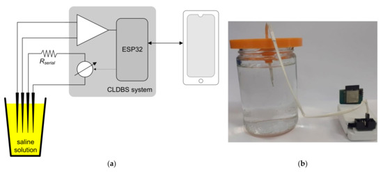 (a) Block diagram and (b) photo of the experimental setup to test the DBS system in a saline solution.