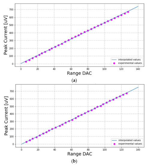 Figure 13a,b show the experimental results of the tests done on a saline solution for serial resistors Rserial of 1 kΩ and 10 kΩ, respectively. The fitted lines on the two plots agree very well with the measurements with correlation coefficients of 99.98%.
