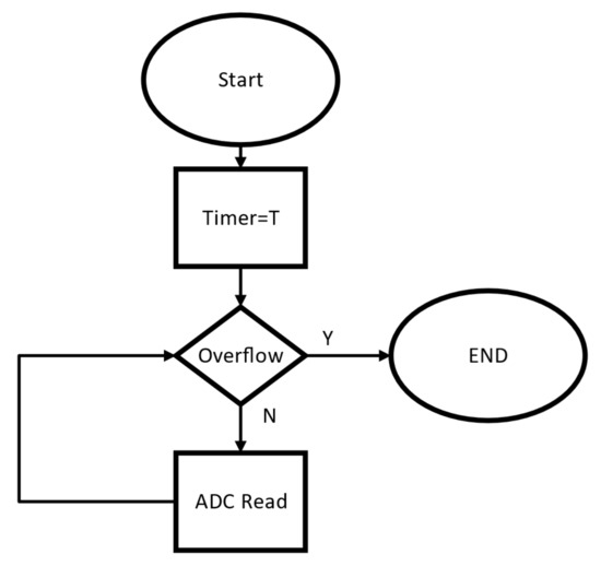 Figure 15 shows the software routine used to control the test. Initially, the timer receives the period value and successive iterations are performed until the timer reaches zero. The number of iterations before the overflow happens is the acquisition rate by milliseconds which is the period of the signal.