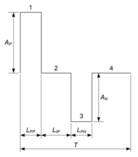 The pulse waveform is divided into four parts. The first step is the positive pulse, the second step is the time between pulses, the third step is the negative pulse and the final step is the time interval between pulses. Figure 16 shows a diagram of a generic waveform generated by the system.