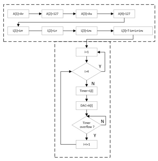 The complete routine from the pulse generation and the timer count is shown in Figure 17. The variables A and L are two arrays that store the values of the pulse amplitude and of the pulse width over time, respectively. The variables A[i] and A[i] are the values stored in the ith position of the arrays A and L, respectively. The amplitude value shown in Figure 17 is expressed in bits and varies from 0 to 255. The 127 value is attributed to A[2] and to A[4] as the middle of the maximum and minimum values that could be achieved by the stimulator, whereas the Ap and An values, which are assigned to A[1] and A[3], are the maximum and minimum values used for the pulse. Figure 17 also shows the timer count routine with values like those illustrated in the flowchart of Figure 15.