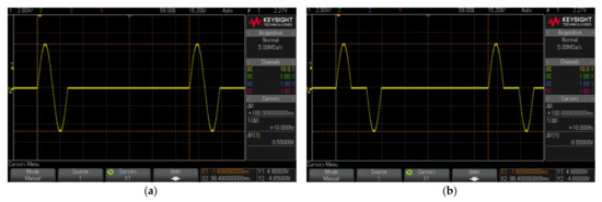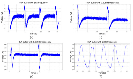 Signals acquired during the loop-back tests in response to the current signals that were injected into the saline solution. The acquired signals also present frequencies of (a) 1 Hz, (b) 0.625 Hz, (c) 0.375 Hz and (d) 27 Hz. These acquired signals correspond to the injected signals illustrated in Figure 19a–d, respectively.