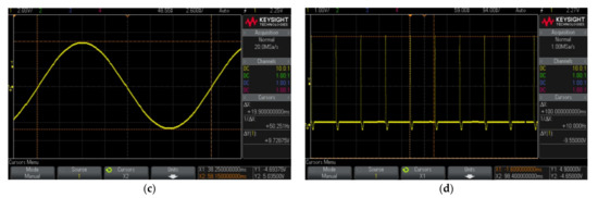 Pulses generated with several shapes by the program and collected on the oscilloscope to illustrate the ability of the proposed stimulator. These signals are currents with (a) sinusoidal shape with amplitudes of ±322 μA with interpulse interval of 0 s, positive and negative pulse widths of 10 ms (50 Hz), and frequency of 10 Hz; (b) sinusoidal shape with amplitudes of ±322 μA with interpulse interval of 10 ms, positive and negative pulse widths of 10 ms (50 Hz), and frequency of 10 Hz, (c) sinusoidal shape with amplitudes of ±322 μA with interpulse interval of 0 s, positive and negative pulse widths of 10 ms (50 Hz), and frequency of 50 Hz; and (d) pulsed shape with positive amplitude of −322 μA, with negative amplitude of −32 μA, positive pulse width of 10 ms, negative pulse width of 20 ms, and frequency of 10 Hz.