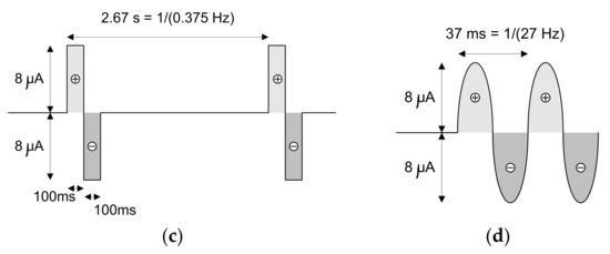 Shapes of the current signals that were injected in the saline solution during the loop-back tests. These current signals present positive and negative amplitudes of 8 μA and frequencies of (a) 1 Hz, (b) 0.625 Hz, (c) 0.375 Hz and (d) 27 Hz.