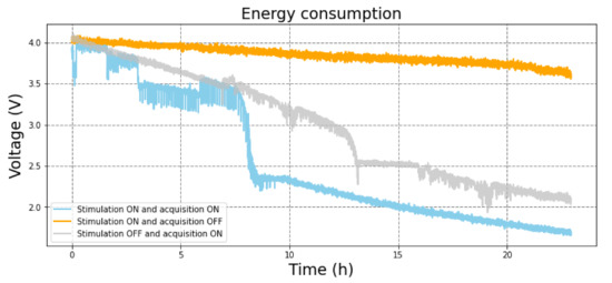 The battery was tested by allowing the CLDBS to work until the battery output value reached below 2.3 V and, therefore, the control unit stopped working. Three scenarios were experimented with: only the stimulation channel on and acquisition off; both stimulation and acquisition on; and only the acquisition on and stimulation off. The results are presented in Figure 21, showing the behavior of the voltage at the terminals of the lithium polymer battery that supplied the CLDBS for the three power consumption profiles. The nominal voltage and capacity of the battery used in these tests are, respectively, 3.7 V and 1800 mAh. When both circuits were on, the battery could hold up to 10 h with the ESP32 working well. For more than 8 h, the voltage remained above 3.5 V. When only the stimulation was turned on, the battery could hold the voltage over 3.5 V for more than 20 h. Finally, when only the acquisition was on, the battery voltage also decreased, but at a later time, after around 13 h. It must be noted that a second experimental setup based on an Arduino board was used to read the voltage that supplied the ESP32, and, hence, the supply voltage of the proposed CLDBS system.