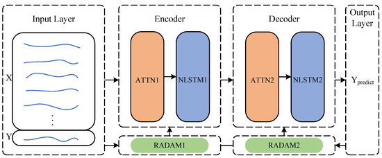 Radam-DA-NLSTM adopts the self-encoder network model structure and has four layers, including the input layer, encoder, decoder, and output layer. It adopts two Nested LSTMs as encoder and decoder, respectively, which use the input attention mechanism to optimize the NLSTM1 encoder and uses the time attention mechanism to optimize the NLSTM2 decoder. And they use the Radam optimizer to update the DA-NLSTM network objective function during encoding and decoding. Figure 1 is the block diagram of the model construction.