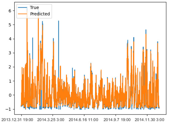 In recent years, air pollution has become extremely serious, and the problem of air quality has attracted more and more attention. Judging the air quality according to the concentration of pollutants in the air reflects the degree of air pollution. PM2.5 refers to particles with a diameter less than or equal to 2.5 microns in the atmosphere, also known as particles that can enter the lung. Although the content of PM2.5 in the earth’s atmosphere is relatively small, it contains a large number of toxic and harmful substances and has a long residence time and long transportation distance in the atmosphere, which greatly affects the air quality and has a direct or indirect impact on human health and plant growth. Therefore, it is very necessary to monitor and predict PM2.5 concentration in real time. The following are the prediction results of this model on the Beijing PM2.5 test data set, and Figure 6 shows the prediction fitting diagram.